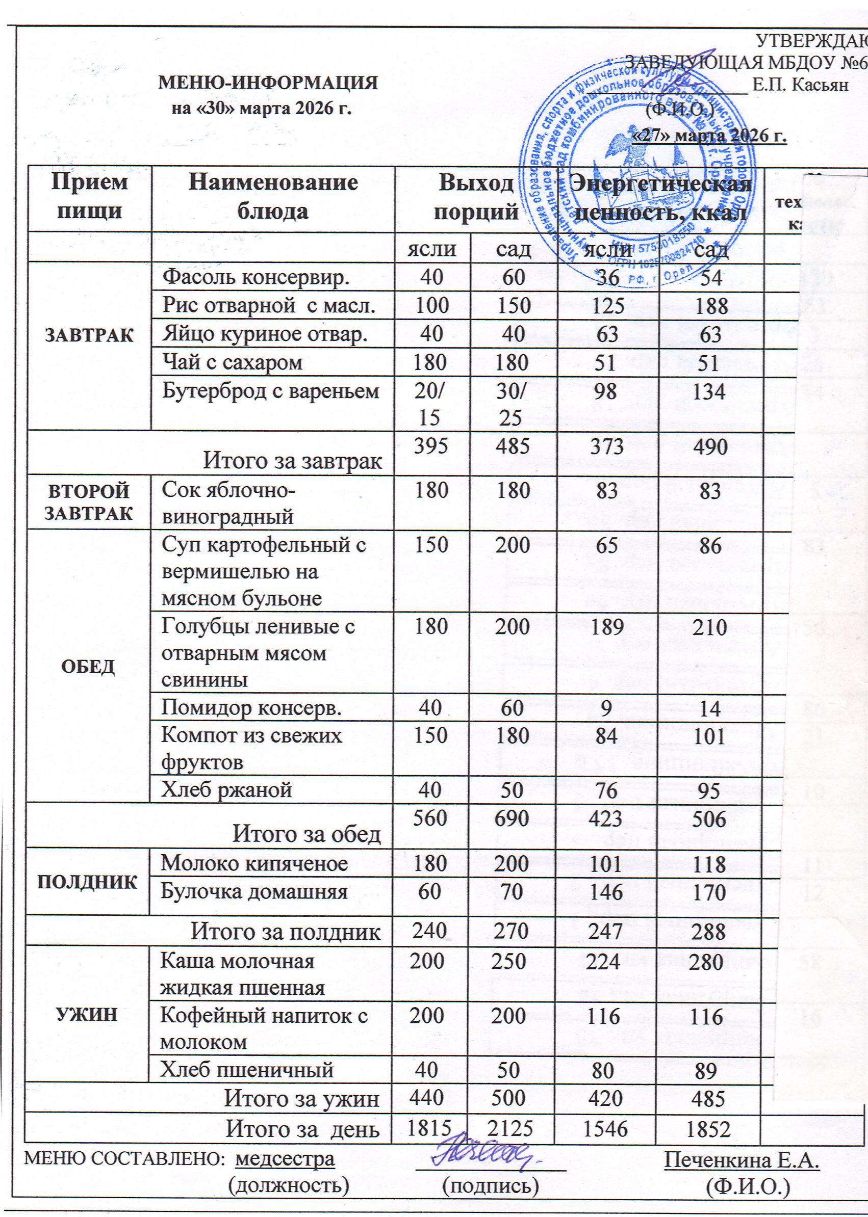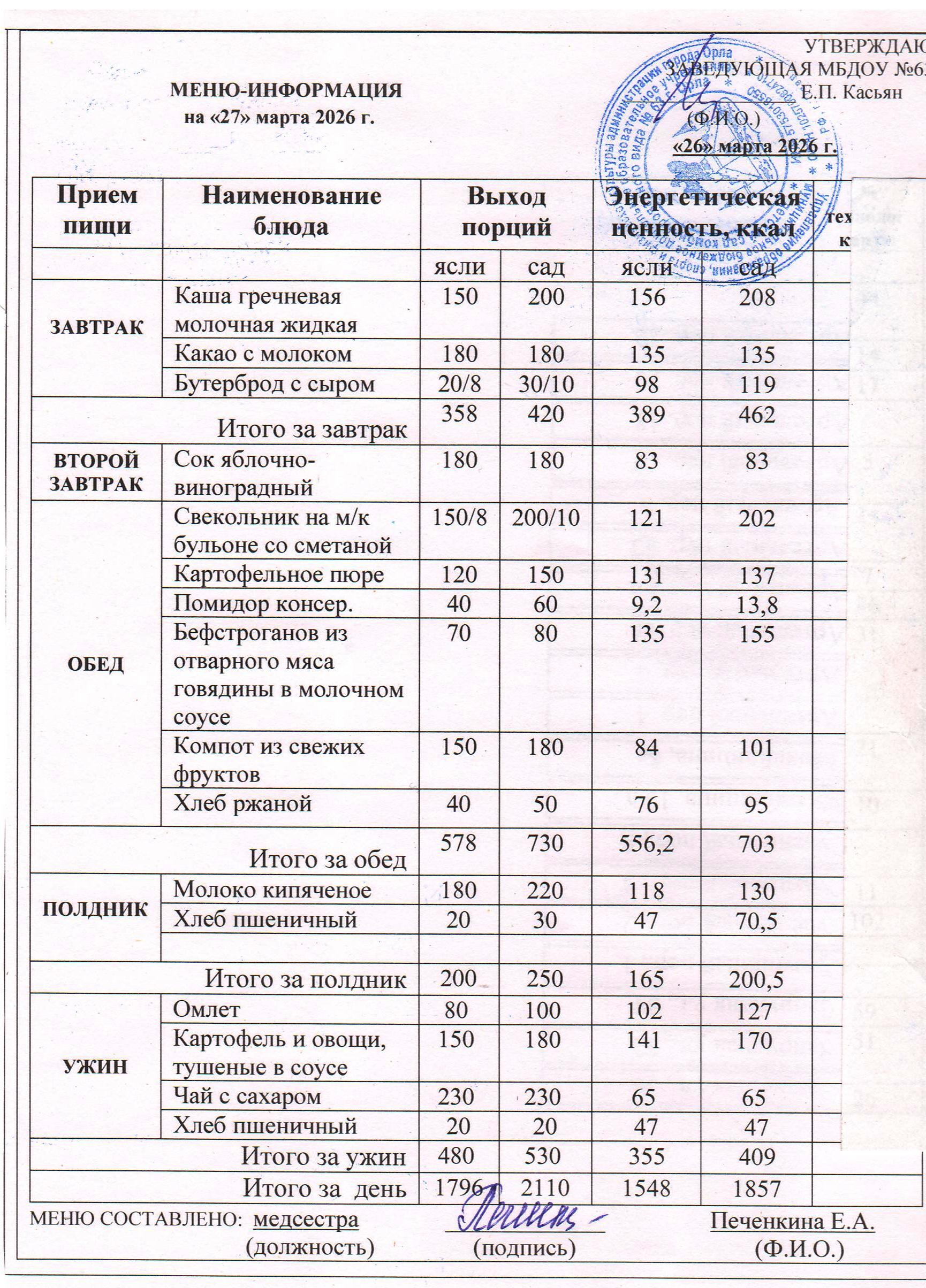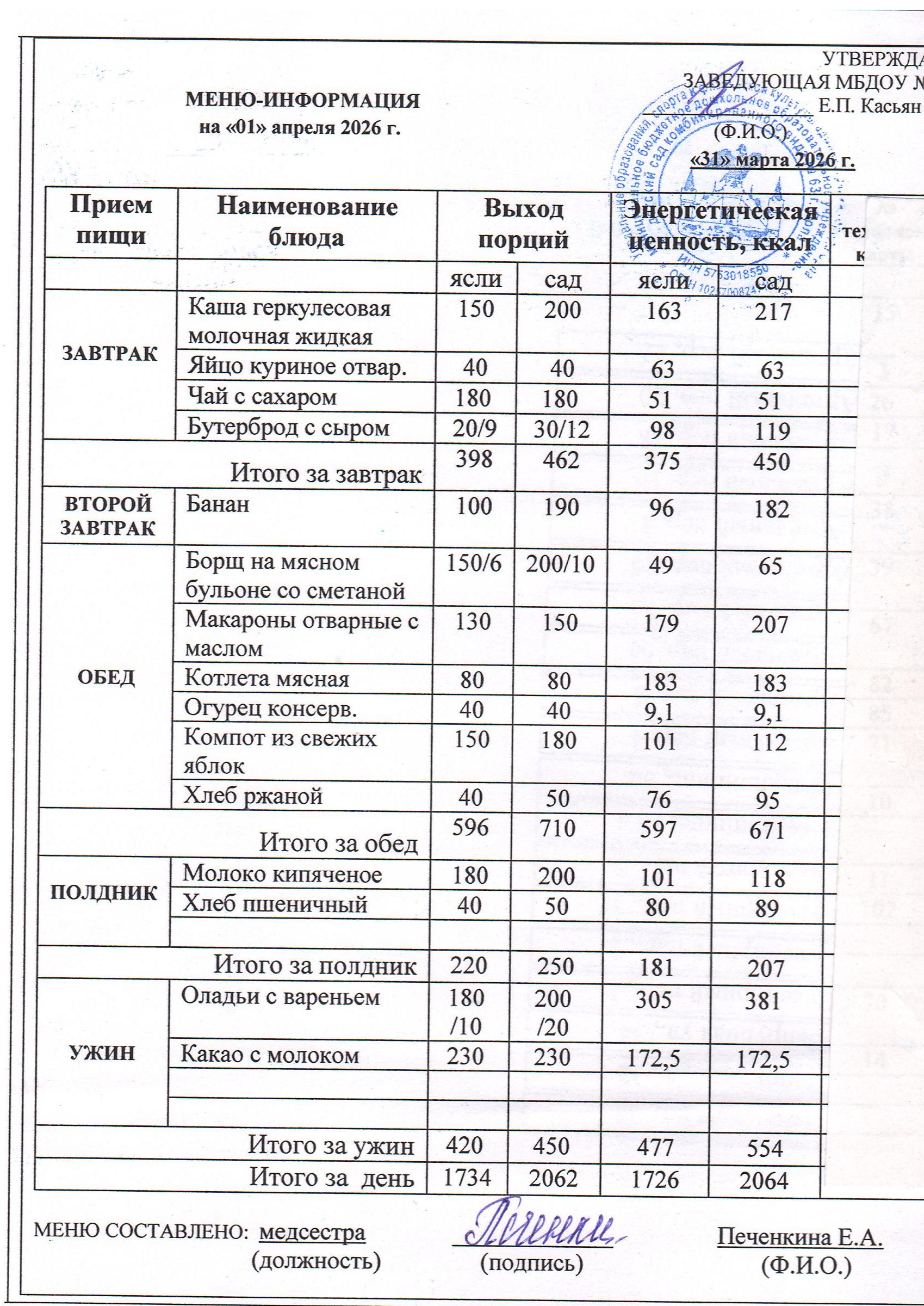 Информацию об ассортименте горячего питания воспитанников родители получают из ежедневного меню, где указан вес и объем блюд, калорийность. Если у ребенка есть хронические заболевания и какие-либо противопоказания к определенным продуктам питания – рекомендуется заранее предупредить об этом медицинскую сестру и воспитателей группы.