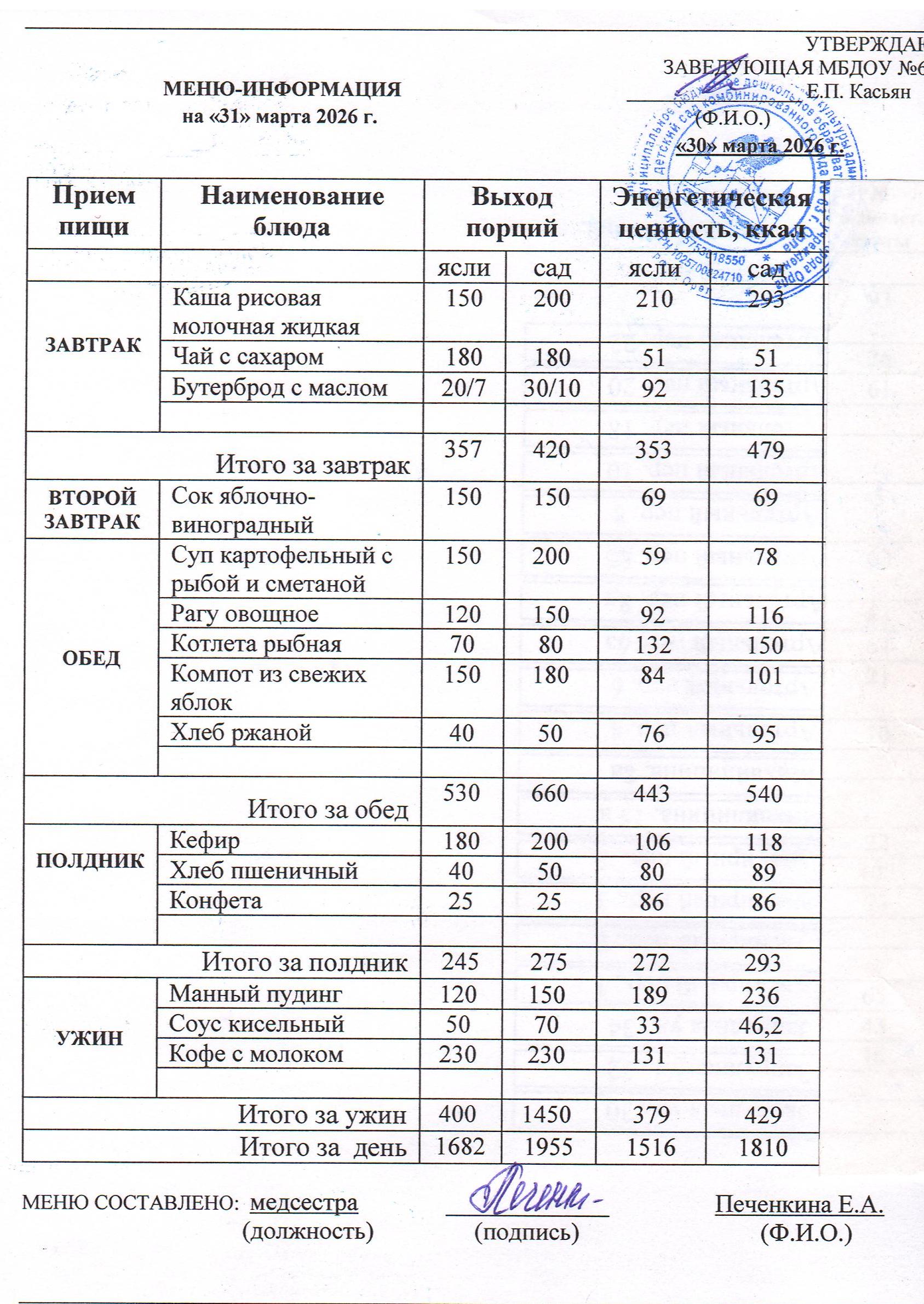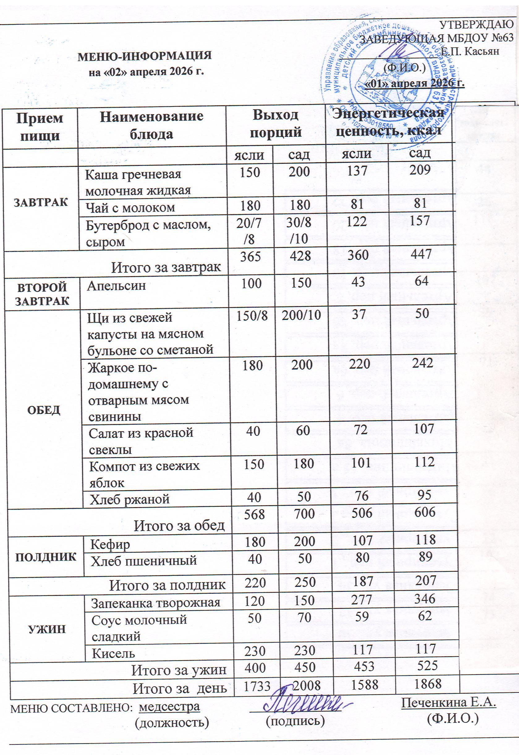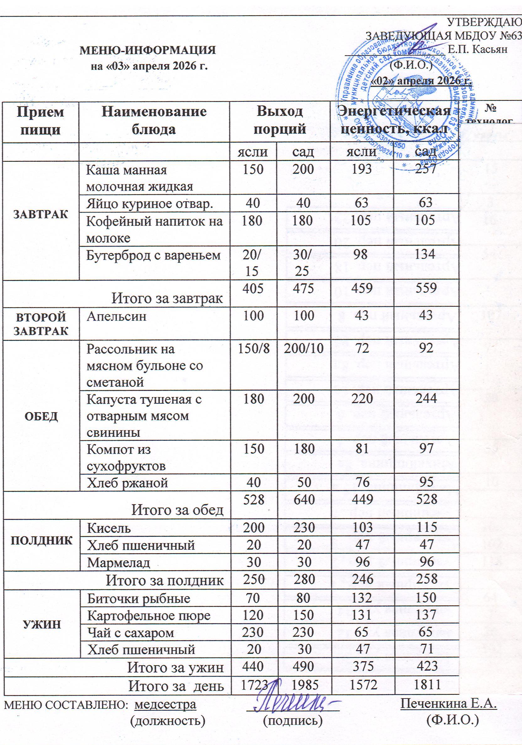 Информацию об ассортименте горячего питания воспитанников родители получают из ежедневного меню, где указан вес и объем блюд, калорийность. Если у ребенка есть хронические заболевания и какие-либо противопоказания к определенным продуктам питания – рекомендуется заранее предупредить об этом медицинскую сестру и воспитателей группы.